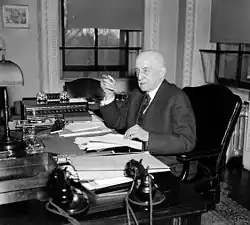 His close friend and political ally, Secretary of State Cordell Hull convinced Moore to join the "Brain Trust" of President Franklin D. Roosevelt, succeeding Professor Raymond Moley.[17] He became an Assistant Secretary of State, where he worked under Secretary of State Hull beginning September 19, 1933, and took Hull's place during travels. Many other Virginia Democrats followed the lead of Senator Harry F. Byrd and opposed the New Deal. Moore handled some patronage in the state, and advised Roosevelt to help Governor James Hubert Price as well as Judge Floyd H. Roberts of Bristol, Virginia, whom Byrd's ally Senator Carter Glass found "personally offensive."[18]