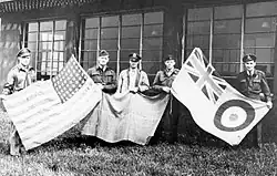 British and American personnel hold up flags at the 496th Fighter Training Group base in Goxhill., 1944