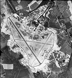 The airfield was built on ancient parkland belonging to Easton Lodge and some 10,000 trees were destroyed to enable its construction,[2][3] including over 200 mature oak trees. It consisted of a set of three converging runways each containing a concrete runway for takeoffs and landings, optimally placed at 60-degree angles to each other in a triangular pattern. The runways were a 6,000-foot-long (1,800 m) main runway, aligned 15/33 and two secondary 4,200-foot-long (1,300 m) secondary runways, aligned 11/29 and 04/22. An encircling perimeter track was also constructed, containing 50 loop-type hardstands.