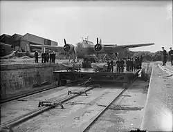 Initially, the seaplane service only operated and carried out maintenance from a specially adapted floating dock known as HMS Flat Iron. This floating dock was able to submerge and allow two seaplanes to navigate onto it and then raise itself back up to allow for complex maintenance.[10] During the 1930s the Royal Air Force improved RAF Pembroke Dock by the installation of two 'B' and one 'T' hangar and in 1938, the floating dock was towed to Invergordon as it was redundant.[10] In 1935, the first spillway was constructed which allowed aircraft to be removed from the water whatever the tide.[11] During this period, Sir Arthur Travers Harris (Bomber Harris) was the Officer Commanding of RAF Pembroke Dock and No. 210 Sqn, as a Wing Commander.[12]