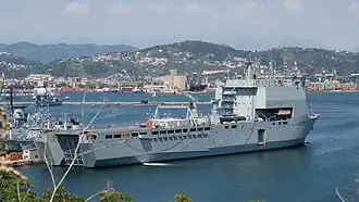 The Bay class was designed as a replacement for the Round Table-class logistics ships operated by the RFA.[6] The new design was based on the Royal Schelde Enforcer design; a joint project between the Dutch and Spanish resulting in the Rotterdam-class and Galicia-class amphibious warfare ships.[6] The main difference with the British ships is the lack of a helicopter hangar.[7] The ships were originally designated "auxiliary landing ship logistics" or ALSL, but this was changed in 2002 to "landing ship dock (auxiliary)" or LSD(A), better reflecting their operational role.[8] Four ships were ordered; two from Swan Hunter, and two from BAE Systems Naval Ships.[6]