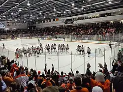 In the 2010–2011 season, the Tigers played in the Maverick stampede but lost both their games against number-4-ranked St. Cloud State and the University of Nebraska–Omaha. The Tigers won yet another regular season title and made it all the way to the AHA championship game, where they fell to the Air Force Falcons by a score of 1–0. Air Force goaltender Jason Torf made 40 saves in the contest.[9] In the 2011–2012 season, the Tigers struggled early on, but bounced back in the second half of the season, eliminating the Bentley Falcons after falling behind 1–0 in the first round series of the Atlantic Hockey playoffs, but prevailing in their next two games. They advanced again to the AHA championship game where they eliminated Niagara in overtime but fell, yet again, to the Air Force Falcons, getting shut out 4–0.[10] The Tigers struggled over the next two seasons, as they finished 2012–2013 with a record of 15–18–5, their first losing record since joining Atlantic Hockey.[11] This was also the first time they were unable to advance to the Atlantic Hockey semifinals at Blue Cross Arena, as they defeated American International College in the first round, but were swept by the Niagara Purple Eagles in the second round, losing in overtime in the second game.[12] The following year (2013–2014), the Tigers played their final season at their home ice rink, Frank Ritter Memorial Ice Arena. The Tigers only won 6 out of 16 games at their home arena.[13] Although they struggled that season, the Tigers participated in the "Frozen Frontier," a 10-day hockey festival at Rochester's Frontier Field outdoor baseball stadium.[14] The Tigers took on their AHA rivals, the Niagara University Purple Eagles on December 14. The teams skated to a 2–2 tie in a snow storm and 16-degree temperatures.[15] In their final game at Ritter Arena, the Tigers defeated their long time AHA rival, the Canisius College Golden Griffins 3–1.[16] In the playoffs, the Tigers won the first game in overtime against Holy Cross before getting blown away in game two by a score of 5–1. In the deciding game, The Tigers led 2–0 but Holy Cross came from behind to tie the game in the second period, forcing overtime where they completed the comeback.[17]