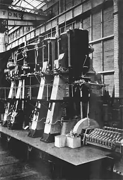 The engines were designed and built by Wallsend Slipway & Engineering Company, neighbours of C. S. Swan & Hunter on Tyneside, and were quadruple-expansion engines. The designer was Andrew Laing, who also designed the triple-expansion engines that powered the RMS Lucania to capture the Blue Riband accolade for fastest average speed crossing the Atlantic in 1894. The quadruple-expansion design could output 12,000 indicated horsepower, with cylinders of 28, 41, 58.5, and 84 inches in diameter, from high to low pressure, and a common stroke of 54 inches. These were fed by nine single-ended scotch boilers 15.5 ft (4.7 m) in diameter and 11.5 ft (3.5 m) deep and equipped with the Howden forced draught system with air drawn into the furnaces with use of a fan. The two engines were connected by Armstrong Whitworth shafts to twin three-bladed manganese bronze propellers on a pair of steel bosses.[12]