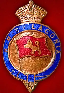 Laconia was built by Swan, Hunter & Wigham Richardson Ltd, Wallsend, Northumberland.[1] Launched on 9 April 1921, she was completed in January 1922.[3] Her port of registry was Liverpool. Her UK official number was 145925, and until 1933 her code letters were KLWT.[1] As a Royal Mail Ship, Laconia was entitled to display the Royal Mail "crown" logo as a part of her crest.