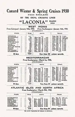 On 21 November 1922, Laconia began an around-the-world cruise, a charter by the American Express Company, which lasted 130 days and called at 22 ports, carrying 347 passengers, mostly leisure travelers. This was the first continuous circumnavigation of the world by passenger liner, a voyage later dubbed the first world cruise.[4]