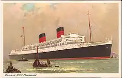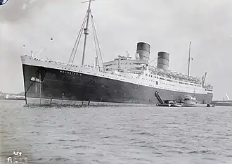RMS Mauretania was a British ocean liner that operated from 1939 to 1965. The ship was launched on 28 July 1938 at the Cammell Laird yard in Birkenhead, England, and was completed in May 1939. She was one of the first ships built for the newly formed Cunard-White Star company following the merger in April 1934 of the Cunard and White Star Line. On the withdrawal of the first Mauretania in 1935, to prevent a rival company using the name and to keep it available for the new liner, arrangements were made for the Red Funnel paddle steamer Queen to be renamed Mauretania in the interim.[2]