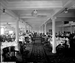 Her public saloons were in historicist styles: Louis XVI for her first class lounge, music room and dining saloon; Dutch colonial for her first-class smoking room[13] and Adam style for her first class writing room and library. The first-class smoking room had a wooden floor of inlaid sycamore.[15]