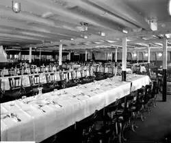Orama had berths for 1,305 passengers: 293 first class, 145 second class and 867 third class.[13] Her first and second class saloons and cabins were on her upper decks. She had two third class promenade decks, on her bridge deck and shelter deck. Her third class smoking room and music room were also on her shelter deck. She had electric passenger lifts.[14]