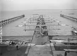 To increase the range of the aircraft, experiments were carried out in the launch and retrieval of flying boats and bi-planes from specially designed lighters towed behind destroyers of the Harwich Force.[2][7]