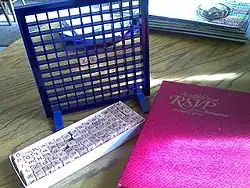 RSVP was a vertical version of Scrabble introduced by Selchow and Righter in 1958 and promoted as "3-D Scrabble". Two players spelled words using cubical tiles with letters on an upright grid board.