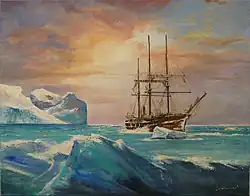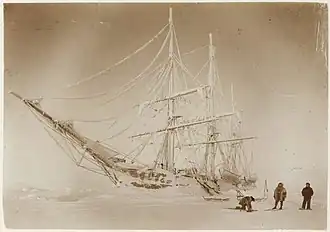 Sailor Carl Wiencke was lost overboard en route to Antarctica, Wiencke Island being named in his honour.[7] Belgica crossed the Antarctic Circle on 15 February 1898.[4] On 3 March, Belgica became wedged in the pack ice. The crew had not prepared for overwintering in Antarctica well. De Gerlache forbade the crew to eat the penguin and seal meat that had been stockpiled because he hated eating it. As a result, scurvy became a problem on board Belgica. Following the death of magnetician Emile Danco on 5 June 1898, the situation worsened.[7] Morale worsened after the death of Nansen, the ship's cat, on 22 June.[6]