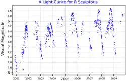 A visual band light curve for R Sculptoris, plotted from ASAS data[17]