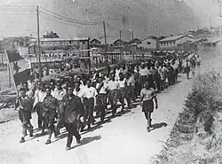After walking north for 16 days over mountains and through forest, the Jewish fighters joined the 7th Partisan Division.[3] In addition to the battalion, 648 former inmates of the concentration camp joined the Partisan movement, meaning that from the Rab camp 1,339 former inmates joined the People's Liberation War.[4] The battalion took part in heavy fighting against Germany's and the Independent State of Croatia's forces in the Croatian regions of Banovina, Kordun and Lika, and due to severe losses suffered the battalion had to be disbanded and its members absorbed by other Partisan units.