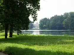 The one hundred and seventy hectares of parkland were given its current design by the German Xavier Kurten, who gave the setting a romantic touch: lakes, canals, bridges, caves, picturesque buildings and old trees populated by several species of birds, including a large colony of storks.[2]