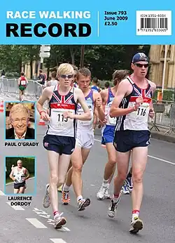 ![]() Race Walking Record cover featuring the British Junior Men's team at the Racewalking European Cup in France. | |