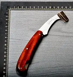 Race knife also known as a timber scribe (scorer, tree marker) is a knife with a U-shaped end sometimes called a scoop knife for cutting marks in wood by lumbermen, carpenters, coopers, surveyors, and others.[1] The reasons for making marks varies and includes keeping count (tally marks), identifying parts (carpenter's marks), numbering, and tracing patterns around a template as a part of marking out. The gouges left by the timber scribe are more durable than pencil or chalk marks.