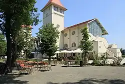 In 1867, a wooden grandstand was constructed by the master carpenter Steib.[3] In 1907, the grandstand was rebuilt as a 2-storey elongated grandstand building with two towers after the plans of the architect Otto Paul Burghardt.[3][4] The architectural style is Historicism and Art Nouveau. In 1907, also a restaurant was added.[5]