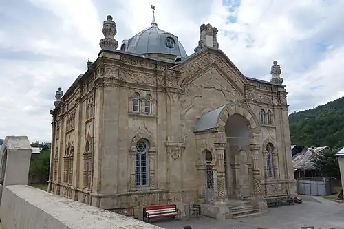 The synagogue in Oni is the third largest in Georgia, and was opened in 1895 after a 4-year construction period. The synagogue is inspired by the Great Synagogue in Warsaw (Poland).[15][14] The rabbi of Oni saw this synagogue during a study in Warsaw and wanted a similar synagogue in Oni. He had a Polish design made in an eclectic style that also has references to synagogues in Tykocin and Krakow. It was built by Greek workers using limestone and rock. By 2021 the Jewish community in Oni is only 12 people small and it is difficult to keep the synagogue open. Services are only held if the attendance is at least 10.