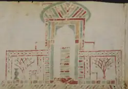 In 1327, Antony of Cremona referred to the cenotaph as "the most wonderful tomb that I shall ever see. I do not think that with 20 pairs of oxen it would be possible to extract or move one of its stones."[59] A Jewish pilgrimage guide (before 1341) describes a large dome, open on all four sides, with ten stones "ten fingers long" topped by one "sixteen fingers long" (diagram left).[60] Nicolas of Poggibonsi (1346–50) describes the grave, including the "twelve stones", as 7 feet high and enclosed by a rounded tomb with three gates.[61]