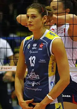 Rachele Sangiuliano (born 23 June 1981 in Noventa di Piave)[1] is a retired female volleyball player who represented Italy in the early 2000s. She was a member of the Women's National Team that won the gold medal at the 2002 World Championship in Germany. After retiring from volleyball, she became a television presenter. Sangiuliano was inducted into the Italian Volleyball Hall of Fame in 2022.[2]