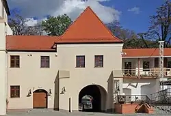 Initially, the building was half the current length and was located in the first section of walls. It was likely built in the 13th century and rebuilt in the 13th/14th century. In the 14th/15th century, the building collapsed and was subsequently reconstructed.[58] The building is set back from the courtyard, leaning considerably to the east. It dates from the first half of the 17th century, built on the foundation of a 14th-century structure, and reconstructed around 1950. The structure is two stories high and rectangular in plan. In the southern part, there is a passage with barrel vaults and lunettes on the arches. Additionally, there is a pointed arch arcade from the former Gothic gate. The northern part consists of several small rooms covered with ceilings. The rooms on the upper floor are also covered with ceilings. There are buttresses on the eastern corners and in the middle of the eastern and western external elevations. The eastern part of the elevation is crowned with two reconstructed gables, destroyed in 1945. The entrance to the castle is semicircular, with a nineteenth-century two-leaf plank gate. There are windows on the ground floor, with a seventeenth-century grille in the west. In the passage to the castle, there is a protruding stone corbel, probably from the Middle Ages. The building has a gable roof covered with tiles, with a transverse hip roof in the western part.[63]
