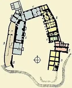 The grand masonry house, known as the princely palace, is attached to the eastern part of the walls and the northern wall of the chapel. Archaeological research confirms the existence of buildings dating back to the 12th/13th century in this location. In the 15th/16th century, the building was thoroughly rebuilt and expanded to the northern frontage of the courtyard. It neighbored the brewery building, located behind the castle walls.[58] The building underwent reconstruction in the first half of the 17th century and after 1858, following a fire at the castle. The residential building is two-story, cellar-equipped, and erected on an elongated rectangular plan, with a slightly broken eastern side. The interior layout features one bay and has been significantly altered. The ground floor predominantly features barrel vaults and barrel-groin vaults with lowered arches. In the southern part, there is a winding staircase, also vaulted. The rooms on the upper floor are covered with ceilings. On the courtyard side, a masonry cloister with columned arcades, semi-circularly closed, is visible at the ground level. The cloister is partially vaulted. On the upper floor, there are protruding roof eaves supported by neo-Gothic wooden columns. The windows in the building have an irregular layout. The gable roof is covered with eternit, with newer dormers.[63]