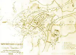 The tunnel is one of the mysteries associated with the castle, which was supposed to lead from the Dominican monastery to the castle. The secret passage was said to have been built at the end of the 13th century, during the reign of Przemysław of Racibórz, when his daughter Euphemia joined the Dominican convent.[16][78] The tunnel was supposed to enable meetings between father and daughter, and also, in case of danger, provide the nuns with an escape route to the castle.[16][79] In 1988, the city authorities, along with the Catholic Church, reached an agreement regarding the renovation of the castle chapel. During the renovation works, a map dating back to 1843 was found in the turret on the spire of the chapel.[16][67][79][80] It depicted the state of the city's buildings from 1843 and 1858 due to handwritten annotations.[67][79][80]