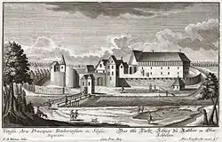 From the 16th century, the stronghold was owned by the King of Bohemia, and then by noble families.[17] In 1521, after the death of the Duke of Opava, Valentine, known as the Hunchback, the rule of the castle was taken over by the Duke of Opole, Jan II the Good.[9][21][23][29] In 1532, after the death of Duke Jan II, Racibórz passed into the hands of the Czech King Ferdinand I.[21][23] In the same year, the existence of a brewery at the castle was mentioned.[30] Shortly thereafter, it fell into the hands of Margrave George the Pious as collateral for debts amounting to 200,000 guilders owed to the Prague court.[21][23][29][30] Between 1532 and 1533, George renovated the destroyed castle buildings.[30] The profits from the Racibórz estate were used to build a castle in Roth near Nuremberg, which is now called Ratibor.[29] The margrave spread Lutheranism in the Duchy of Racibórz during this time.[21] After repaying the debt to the Hohenzollerns, the castle returned to the possession of the Habsburgs, who entrusted the Duchy of Racibórz to various families.[23] The first owner of the stronghold was Isabella Jagiellon, the daughter of Sigismund I the Old and Bona Sforza.[21][23][29] She received the Opole-Racibórz Duchy from Emperor Ferdinand I after relinquishing her rights to the Hungarian crown. In 1556, she renounced her Silesian estates and returned to Hungary.[23][34]