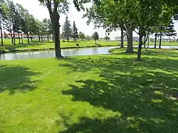 The first insane patients were admitted to the Racine county poorhouse in 1855. The construction of a separate building for the insane was approved by the county board of supervisors on November 26, 1888. The asylum admitted its first three patients on December 18, 1889.[1] By 1904, the hospital housed 133 patients.[2] On February 19 of that year, the building was destroyed in a fire.[3][4] The asylum was rebuilt quickly after the fire, and a home for the county poor was added to the facility in 1918.[5] The institution was also known as the Gatliff Asylum and was served by the Gatliff stop on the railroad.[6][7] Gatliff was named after Nelson Gatliff (1813–1898), an early pioneer in Racine County who owned extensive farmland.[8] The facility was also used as a tuberculosis sanatorium.[9] Later it was known as High Ridge Hospitals[10] and High Ridge Health Care Center of Racine County.[11] It was closed on October 1, 1986, at which time the approximately 210 residents who were there were moved to the new Ridgewood Health Care Center.[12] Asbestos removal in, then demolition of, High Ridge Health Care Center began in October 1988, to be completed by early 1989.[13] The site is now a retail development known as High Ridge Centre, with only the old duck pond remaining from the former asylum.[14]