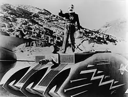 This serial is heavily padded with rocket-suit effects footage first filmed for the earlier King of the Rocket Men, to which some believe this was a pseudo-sequel. Despite reports that a repainted Juggernaut vehicle from Republic's much-earlier Undersea Kingdom serial is reused here as Retik's lunar tank,[6] the tank-like Moon "Scout Car" was not used in the earlier serial. All spaceship footage was filmed new for Radar Men from the Moon. Outer space is shown as brightly lit, and the characters are shown walking on the Moon, in normal Earth gravity and in daylight, without pressure suits. The laboratory building is actually a Republic Pictures office building with a prop "Cody Laboratories" sign added to its exterior.[6]
