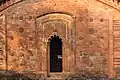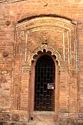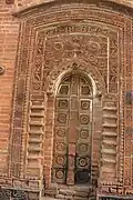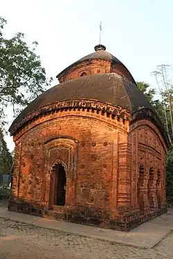 The Radha-Vinoda Temple in Bishnupur, located in the Khar Bangla area, is one of the two at-chala style temples in the region. Despite significant damage to the upper roof and entrance wall, the temple remains an important architectural and historical site.[3] This temple is particularly notable for its intricate design and its unique at-chala construction, where the roof consists of eight sections. However, due to a narrow break between the upper and lower roof sections, the temple gives the impression of a char-chala structure, which typically features four sloping roofs. Facing east, the temple stands on a nearly square plinth measuring approximately 6.4 meters in length and 6.2 meters in breadth. The overall height of the temple is about 10.7 meters. Despite the collapse of some parts of the structure, the temple's rich decorative elements would have originally showcased the craftsmanship of the time. The temple's construction reflects the cultural influence of Vaishnavism and the patronage of local rulers like Raghunatha Singha during the 17th century.[1]