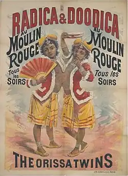 The girls were removed from the sadhus' care by an English promoter called Captain Coleman, and they sailed for Europe with him in 1892.[4] Their first public exhibition outside of India was at the Royal Aquarium in London. In 1893, they traveled to the United States, where they were displayed at the World's Columbian Exposition in Chicago that year. Also in 1893, the British Medical Journal published a report about their physical state, finding them "free from all element of repulsiveness" and "apparently perfect in every respect, except that from the ensiform cartilage to the umbilicus they are united together."[5] Another medical journal reported that "the children seldom quarrel".[6] After their Chicago appearance, the Orissa Twins toured extensively with the Barnum and Bailey Circus sideshow.[1] They were said to speak English, French, and German, and to have a Scottish governess.[7]