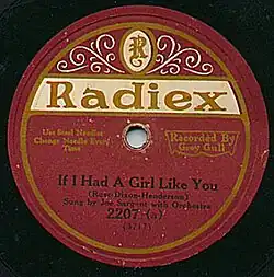 Radiex Records was an American record label during the 1920s. It was manufactured by Grey Gull Records of Boston, Massachusetts, from 1921 until the demise of Grey Gull in late 1930; it was then pressed for a few more months into 1931 by the successor firm, which continued the Radiex, Van Dyke and Madison labels. Radiex records were sold in Montgomery Ward catalogs although they were not manufactured specifically for that firm. In some cases, records have been found which had the labels of other Grey Gull products over Radiex labels or vice versa.