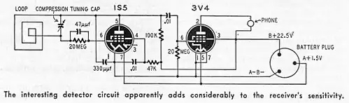 The 1S5 tube functioned as a regenerative detector. Audio detected by the 1S5 was resistance-coupled to the 3V4, where it was amplified and supplied to the earphone.