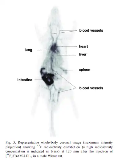 - ^ a b c d e f g h i j k l m Berndt, M.; Pietzsch, J.; Wuest, F. (2007). "Labeling of low-density lipoproteins using the18F-labeled thio-reactive reagent N-[6-(4-[18F]fluorobenzylidene)aminooxyhexyl]maleimide". Nuclear Medicine and Biology. 34 (1): 5–15. doi:10.1016/j.nucmedbio.2006.09.009. PMID 17210457.