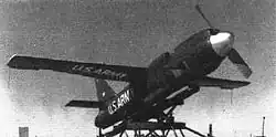 The design of the RP-77D made extensive use of glass-polyester plastic materials.[2][3] The drone was launched using a rocket-assisted take-off system consisting of four Loki rockets, and was fitted with a radio control apparatus that, with the assistance of radar tracking, allowed the drone to be operated at a considerable distance from its launching point.[1] In addition to equipment typically carried by target drones, the RP-77D could be equipped with reconnaissance or meteorological sensors, or with air sampling equipment.[1] The RP-77D utilised the RPTA tracking system, developed by Radioplane, using audio frequency tones for control.[4] Tip tanks allowed for carriage of additional fuel to extend the aircraft's range, and recovery at the end of the flight was by parachute.[5]