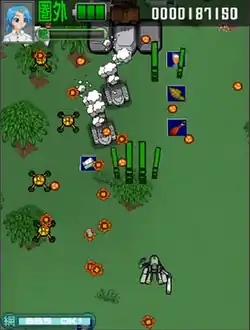The game features bullet hell gameplay elements, providing the player with a small hit box and swarms of particles to evade. Most of the bullets come in patternless waves with the exception of bosses which feature more structured patterns.[2] The player may choose from three different ships each with a different speed setting, and may also choose from three different weapons: spread gun, homing laser, and bubble cannon.[3] Each weapon behaves differently, so the player must utilize different strategies with them.[2] The player is also equipped with a sword and shield.[3] The sword and main weapon can be used to destroy the enemies and some bullets, and can also deflect items. This deflection mechanic allows the player to "juggle" items and power-ups until they are desired.[2] When not firing, a shield is automatically deployed which can deflect some bullets.[2] A combo bar, which determines the score multiplier, can be increased by either using the shield to harvest energy from bullets or enemies, or using the ABSNET shield, a weapon which eliminates all minor enemies and bullets on the screen. In order to use the ABSNET shield, the player must fill a gauge by gathering blue items which drop from destroyed enemies.[1][2][3]