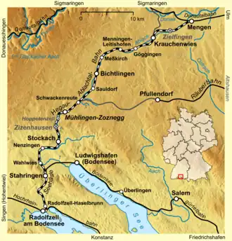 The Radolfzell–Mengen railway (also called in German the Hegau-Ablachtal-Bahn—Hegau–Ablach Valley Railway) is a branch line in the German state of Baden-Württemberg. It runs from Radolfzell via Stockach to Mengen. The line was built as a mainline connection from Ulm via Lake Constance (Bodensee) to Switzerland. Regular passenger services were abandoned between 1972 and 1982. Passenger services were reactivated on the southern section between Radolfzell and Stockach in 1996 and has since been operated under the brand name of Seehäsle. The northern section from Stockach to Mengen is however only used for freight trains and passenger excursion trains. In 2005, it had to be temporarily closed because of the deterioration of the infrastructure on some sections. Since 2021, trains have once again been running between Stockach and Mengen on Sundays and public holidays under the brand name of Biberbahn.[3]