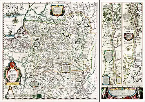 In 1631, Blaeu included it in his atlas Appendix Theatri A. Ortelii et Atlantis G. Mercatoris. In the first edition, the map was published on four separate pages thus preventing a reader from seeing the entire map at once.[19] A second edition from the same year corrected this by cutting off the copperplates with the diagram of the lower Dnieper – thus the entire map was now on six copper plates. The main map measuring 73 cm × 75 cm (29 in × 30 in) was then added as a foldable loose-leaf insert. The Dnieper diagram was printed in the atlas separately.[19] The atlas also included Descriptio Lituaniae, a 7-page Latin description of the geography and history of the Grand Duchy of Lithuania, and 1.5-page Latin description by Tomasz Makowski that is sometimes included at the bottom of the wall map.[20] The longer description was based on the chronicle by Alexander Guagnini first published in 1578.[21]