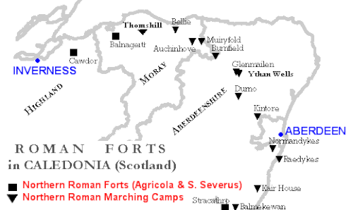 The Roman army established a chain of forts and camps during the late first century AD at Ardoch, Strageath, Inchtuthil, Battledykes, Stracathro, Raedykes (probably), Normandykes, Glenmailen, Bellie, Balnageith and Cawdor. Many of these forts and camps were reoccupied during the reign of emperor Septimius Severus about a century later.