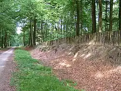 From 1653, Alexander II von Velen had a "zoo" created to the west of the castle as a hunting park. For this purpose, an area of around 100 hectares was enclosed by a rampart around five kilometers long with attached palisades.[9] Local game such as wild boar, roe deer and red deer were kept for hunting within the zoo. However, exotic animals were also kept: The oldest evidence of fallow deer in North Rhine-Westphalia, unknown until then, comes from Raesfeld in 1664. In 1670, John Maurice, Prince of Nassau-Siegen presented Alexander II with an "American pregnant buffalo cow, as Your Grace is a particular lover of foreign animals and the best".[10]