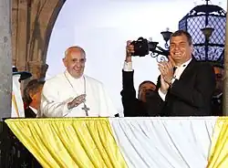Correa decided to campaign for the presidency in the 2006 presidential election, although at the time he was a largely unknown figure among the Ecuadorean public.[22] Employing Vinicio Alvarado as his campaign manager, Correa's campaign emphasised his personality as a macho family man of modest origins who was angry with the country's political elites.[23] During his campaign, he described himself as the head of "a citizen's revolution" against the established political parties and corrupt elites,[24] and depicted himself as the leader of a second independence movement devoted to freeing Ecuador from American imperialism.[24] Touring the country aboard a motorized caravan attending political rallies, he emphasized this opposition using campaign songs such as Twisted Sister's "We're Not Gonna Take It", as well as through the slogan "Se viene el correazo" ("Here comes a whipping"), a pun on the fact that "Correa" can be translated as whip.[23]