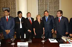 Presidents of South American countries meet in Rio de Janeiro. From left to right: Rafael Correa (Ecuador), Evo Morales (Bolivia), Luiz Inácio Lula da Silva (Brazil), Michelle Bachelet (Chile), Hugo Chávez (Venezuela) and Nicanor Duarte (Paraguay)