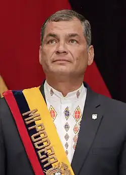 Rafael Correa was officially declared President on 4 December 2006 by the electoral court. He was sworn in on 15 January 2007 as the 45th president of Ecuador, the seventh to occupy the post since the legislature removed President Abdalá Bucaram 10 years earlier in the midst of a debt crisis that had devastated the country. His inauguration was attended by most regional leaders, as well as the Iranian president and the Spanish Crown Prince.[39] Declaring that "Ecuador had voted for itself",[40] Correa proclaimed that his election meant an end to neoliberalism in the country.[41] Invoking the name of African-American civil rights activist Martin Luther King Jr., Correa also spoke out against racial discrimination against indigenous and Afro-Ecuadorians in his speech.[42] During the ceremony he wore a shirt decorated with motifs from the prehistoric Jama Coaque culture.[43]