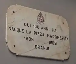 Esposito's restaurant still exists on the spot where it was founded by Pietro Colicchio, at Salita Sant'Ana di Palazzo 1/2, although its current name is Pizzeria Brandi. The royal letter favoring Esposito's pizza is on display in the restaurant.[2] Later research cast doubt on this legend, undermining the authenticity of the royal letter of recognition, pointing that no media of the period reported about supposed visit and that both the story and name Margherita were first promoted in the 1930s–1940s.[6][7]