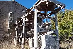 Located on the north west corner of Portion 52, the bottle kilns in close physical relationship with 'Raffan's Mill' c. 1889 - a small, single level, nineteenth century brick structure still displaying its mill grinding machinery. Also rare, the mill consists of three separate areas and appears to have been part of a larger complex. The building dimensions are 15.5 metres (51 ft) long, 12.7 metres (42 ft) wide and 6.4 metres (21 ft) high to the peak of the gable. The roof and half of the northern wall are sheeted with galvanised corrugated iron with all other walls being 370 millimetres (15 in) thick brick laid in English bond. The western side of the building has three large hinged door openings, with the northern end having been utilised as a general store. The southern end was once used as a blacksmiths shop. Internally there is evidence of a mezzanine level supported by 300-millimetre (12 in) timber beams, with windows and a number of unidentified operational openings having been bricked up. Through the southern wall, extends a shaft-driven system of wooden toothed gear wheels and four 1,200-millimetre (47 in) diameter Burr Stone Grinding Mills. The millstone grinding plant was installed between 1889 and 1895 to grind the cement clinker from the bottle kilns. It is of cast iron with three granite millstones. The large gear wheels have removable timber cogs held in place by pegs. Originally the plant was connected by belt to a small steam engine which no longer remains. Some surrounding structure have also gone.[9][1]