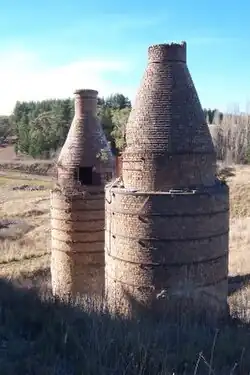 The Cullen Bullen Lime & Cement Company plants on the Portland site used eight static charge (bottle-shaped) kilns with millstone grinding, powered by a small steam plant. As high temperatures were necessary, the open end was of small diameter and chimney-shaped to conserve heat and to induce greater draught through the kiln. Layers of limestone, shale, and timber were hand-packed in each kiln, leaving space for a flue. The doors were then sealed and the kilns fired. The resulting batch of clinker was then removed. Two of these early bottle kilns – built of brick with iron ties and turnbuckles – and the milling plant in the northwest corner of Portion 52 stand as historical monuments to the beginning of the cement industry in NSW.[1][9]