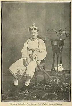 Raja Sir Raghunathrao Shankarrao Gandekar (also known as Babasaheb Pandit Pant Sachiv) KCIE, KGSJM, KECM, KGCM, DD (20 September 1878 – 27 August 1951) was the 11th ruler of the princely state of Bhor of British Raj during the reign (1922–1951).[3] During his reign, he implemented many reforms such as abolition of untouchability, freedom of association and introduction of representative government.[4] He signed the accession to the Indian Union on 8 March 1948 which ended the separate existence of Bhor state.[5]