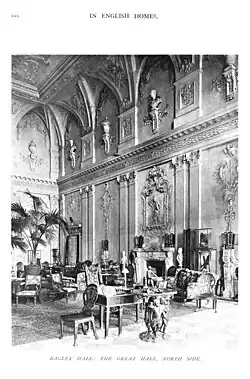 The secondary seat of the Seymour-Conway family, Earls of Hertford, was Sudbourne Hall[5] in Suffolk and their London townhouse was Hertford House.[6] Financial instability of the Seymour family left the house threatened with demolition more than once. In 1912, following the death of Hugh Seymour, 6th Marquess of Hertford, the estate's trustees recommended that the house be demolished. However, during World War I and World War II, the house found use as a military hospital. Hugh Seymour, 8th Marquess of Hertford, who in 1940 inherited Ragley Hall from his uncle George Seymour, 7th Marquess of Hertford, fought to save it after the war. It was refurbished between 1956 and 1958, when it became one of the first stately homes opened to the public.[7]