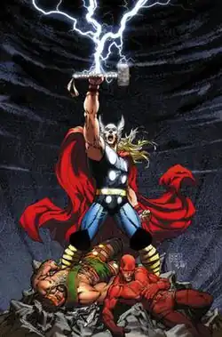 During the "Siege" storyline, Volstagg encounters Ragnarok after being released from jail by the Broxton sheriff. Volstagg fights him on an open field to avoid more deaths, but Volstagg is defeated.[7] Thor later fights Ragnarok and easily destroys him.[8]